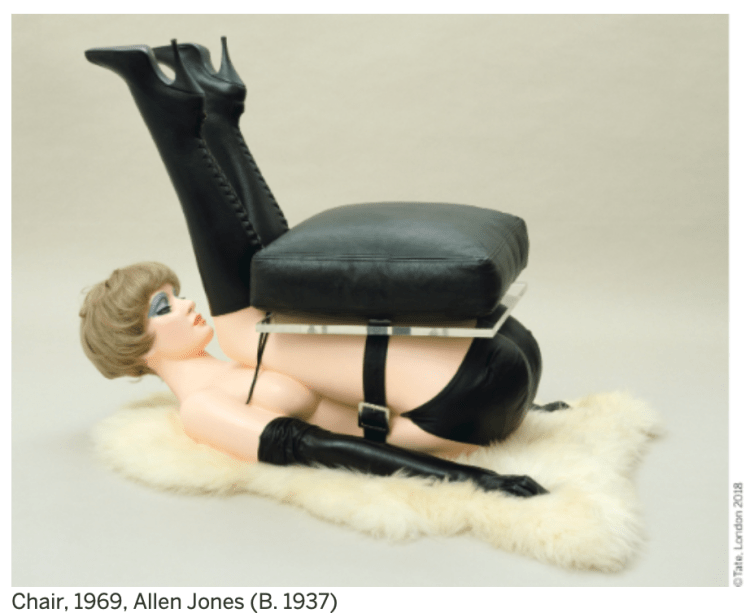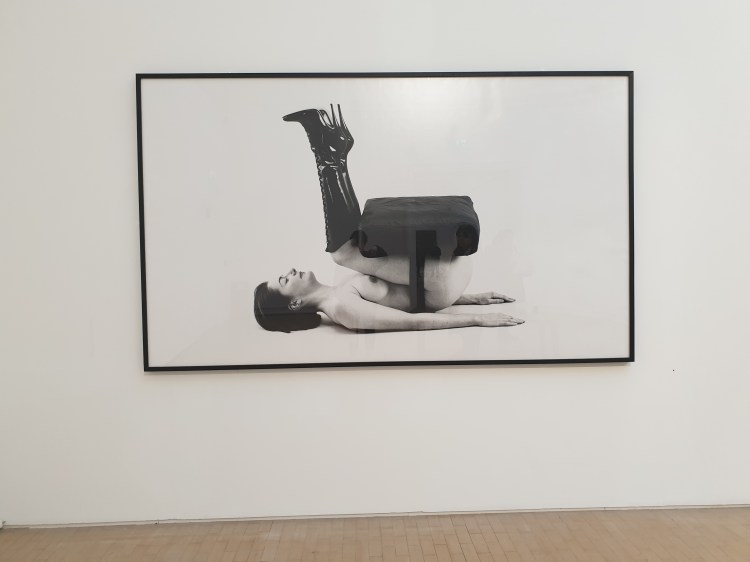 Upon research I found this photograph was a response to Allen Jones’ controvesial sculpture ‘Chair’, which caused outrage in feminist groups, and was protested against for objectifying women and fetishising the female body. I think by recreating the sculpture using herself with no makeup, in black and white, strips away the problematic “male gaze” aspect of the original piece. She has recreated it with a natural looking woman, stretch marks visible, to celebrate and exhibit the female form on her own terms.