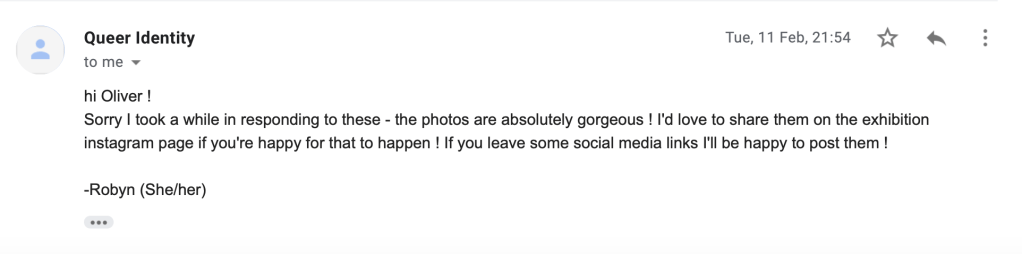 Through this exhibiton I have gotten positive feedback from a couple of people, and connected with other queer artists through social media. Although, from seeing my work printed and hung, I felt it was very minimal, which works for on screen but I learnt that when physically exhibited I needed to add more photographs from the series to make it more substandtial and display it on bigger scale prints. If exhbited again I would include more photographs and present it differently to communicate more of a clear narrative, as it reflects a documentation of a journey of recovery from top surgery of a transgender man.